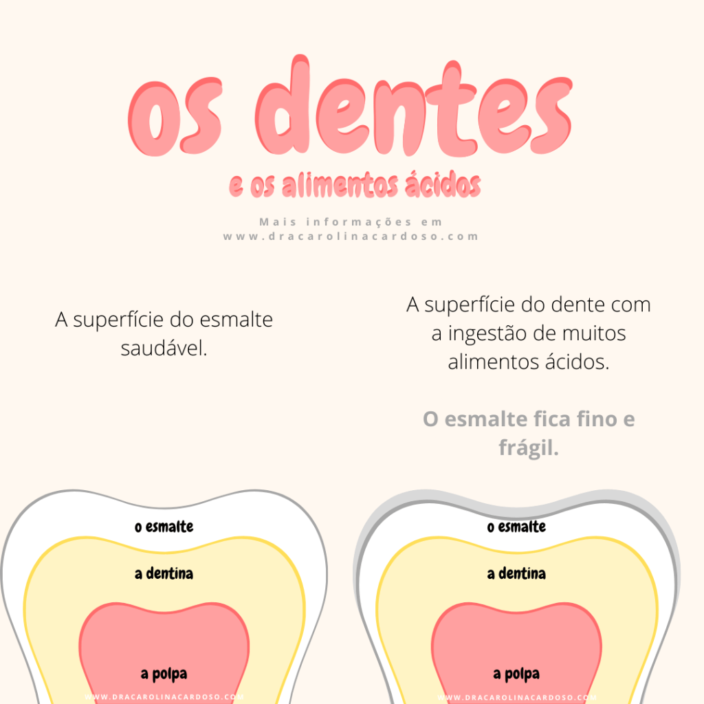 - Evitar comer frequentemente alimentos ricos em ácidos ou lavar os dentes após ingerir alimentos ácidos já que os ácidos diminuem o pH presente na cavidade oral e “atacam” a superfície do dente, a camada de esmalte. O esmalte é a camada superficial dos dentes e é muito sensível aos ácidos. Que alimentos são ácidos? O limão, laranja, tangerina, maçãs (principalmente as verdes), tomate, kiwi, todas as bebidas com gás e entre outros. Muitos dos alimentos indicados anteriormente são ótimos para a nossa saúde e devem ser incluídos na alimentação diária, por exemplo, os cítricos são ricos em vitamina C. A vitamina C ajuda o sistema imunitário, o nosso sistema de proteção. Quanto mais o esmalte for “atacado” mais amarelos aparecem os dentes.